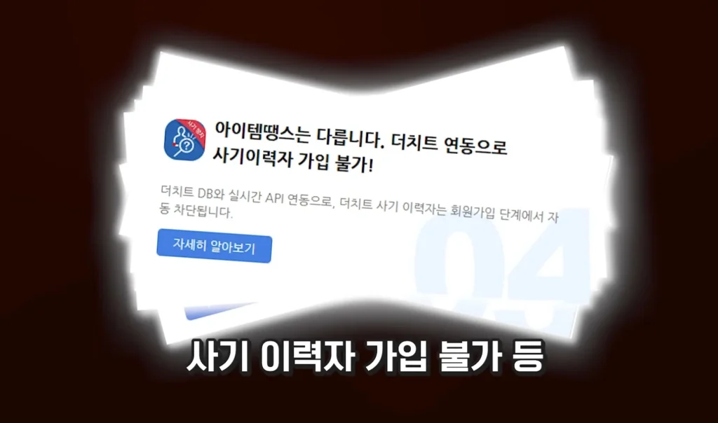 국내 최대 사기 피해 정보 공유 플랫폼인 더치트와 공식 제휴를 맺고 가입 단계에서부터 철저한 필터링을 실시합니다. 가입 시 본인 인증 과정에서 실시간으로 사기 이력을 조회하며, 과거 부정 거래 이력이 단 한 건이라도 발견될 경우 서비스 가입 및 이용이 불가능합니다. 이는 악성 유저의 유입을 사전에 차단하는 아이템땡스만의 가장 강력한 선제적 방어 기제입니다.